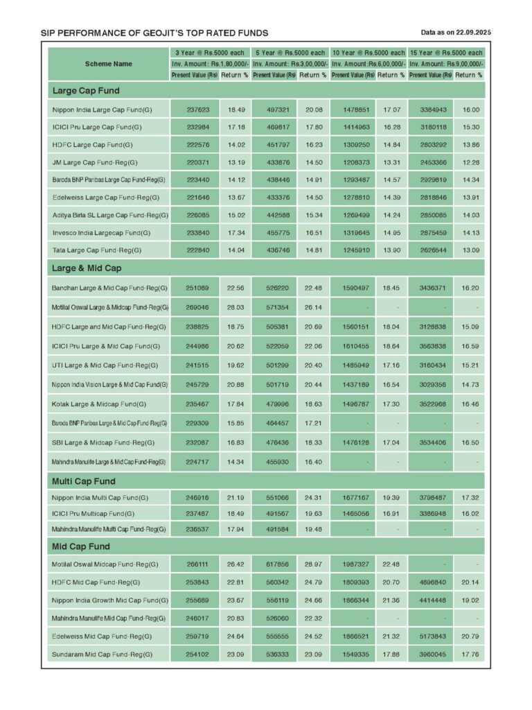 OOur Recommendations SIP performance of Geojit’s top rated funds – October 2025 byGeojit TeamSeptember 30, 2025 0 Shares 0 0 0 0 0 Shares: Share 0 Tweet 0 Share 0 Share 0 Geojit Team Leave a Reply Cancel replyYour email address will not be published. Required fields are marked *Comment * Name * Email * Website Save my name, email, and website in this browser for the next time I comment. What is 3 + 5? * View Comments (0)