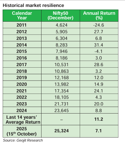 India has provided an average return of 11.2 percent in the last 14 years. The market has generally posted positive yearly returns, with exceptions primarily arising from global disruptions such as the US financial crisis in 2009, the European sovereign debt crisis of 2010–11, the sluggish US economic recovery in 2013 due to high debt, the Fed’s tightening policy in 2015, the Chinese market crash in 2015–16, and the Greek debt crisis in 2015.