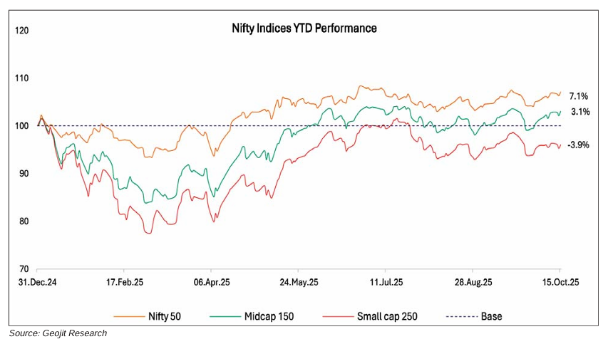 On the positive side, even amid challenging conditions, India delivered respectable nominal returns of 8.8 percent in 2024 and 7.1 percent in 2025 (as of 15th October). The last 12 – 15 months have been particularly difficult for the domestic market, facing unexpected setbacks ranging from tariff changes to geopolitical tensions. However, going ahead risks like low earnings growth and tariff problems are expected to be reduced, setting the stage for improved market performance by year-end.