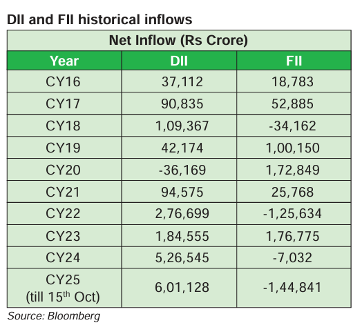 Year till date, as on 15th October, the Indian equity market has delivered a modest 7.1 percent return on the Nifty50 index. Concurrently, the broader market has remained weak, with subdued performance across mid- and small-cap stocks. The last two years have been challenging for domestic investors, who have continued their steady investments despite muted returns. DII’s annual investment reached Rs 6 lakh crore, which is 6 times the annual average before 2023.