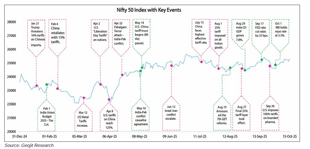 Lately, the Trump narrative has moderated when the US market took a dip; however, the policy continues to hang as a burden. Progress in Israel-Hamas peace and a change in the Fed’s tone to cut rates and liberalize the quantitative tightening policy have provided a push to world equity lately. Additionally, Indo-US trade talks are reportedly advancing, with a mini-deal expected by the end of November. If these developments materialize as anticipated, the year could close on a relatively strong note.