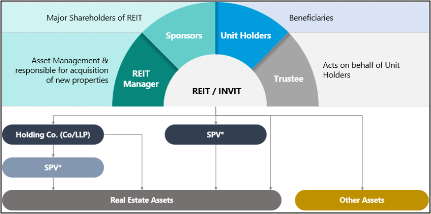 REITs (Real Estate Investment Trusts) and InvITs (Infrastructure Investment Trusts) are investment vehicles that allow investors to invest in real estate and infrastructure assets respectively, without owning the physical property. Simply put, REITs invest in completed and under-construction real estate projects whereas InvITs invest in infrastructure projects.