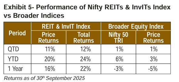 For all the talk around accessibility and yield, REITs and InvITs are ultimately judged by how they perform against traditional assets. In India, their progress is now trackable through the Nifty REITs & InvITs Index (Factsheet_REITs_InvITs.pdf), which offers a snapshot of how these income-generating trusts stack up against the broader equity market. The index is diversified across realty 73.7 percent, Power 18.7 percent, Services 6.49 percent, and Construction 1.09 percent with a total of 9 constituents.