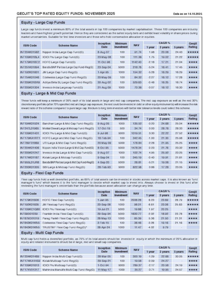 22025 Issue Geojit’s top rated equity funds – November 2025 byGeojit TeamOctober 31, 2025 0 Shares 0 0 0 0 0 Shares: Share 0 Tweet 0 Share 0 Share 0 Geojit Team Leave a Reply Cancel replyYour email address will not be published. Required fields are marked *Comment * Name * Email * Website Save my name, email, and website in this browser for the next time I comment. What is 9 + 2? * View Comments (0)
