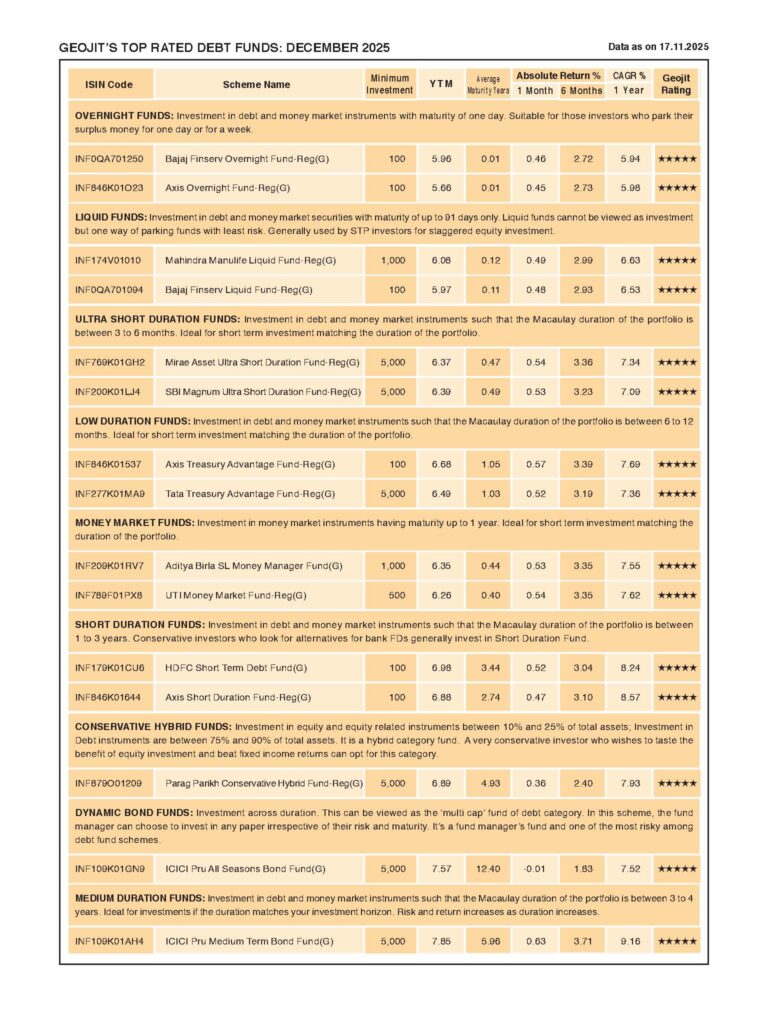 22025 Issue Geojit’s top rated debt funds – December 2025 byGeojit TeamDecember 1, 2025 0 Shares 0 0 0 0 0 Shares: Share 0 Tweet 0 Share 0 Share 0 Geojit Team Leave a Reply Cancel replyYour email address will not be published. Required fields are marked *Comment * Name * Email * Website Save my name, email, and website in this browser for the next time I comment. What is 6 + 3? * View Comments (0)
