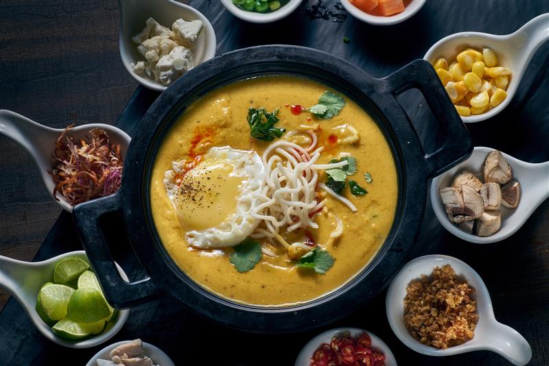 Soon, each of us received a tray: one large bowl of coconut-based broth and noodles, surrounded by little bowls of chilli oil, fried garlic, crushed peanuts, and lime.