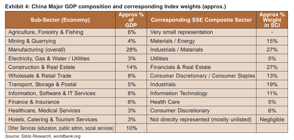 Financials & Real Estate dominate the stock index, far exceeding their direct GDP share, because of Stage Owned Enterprise Banks and large real-estate firms. (Exhibit 4)