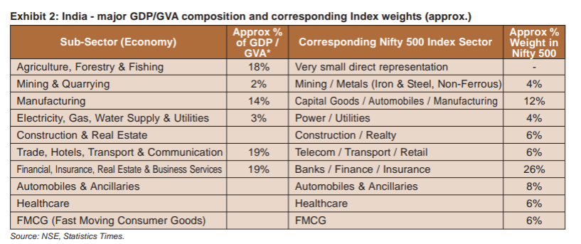 So far, what we have clearly established is that the GDP construct of a country is a very broad establishment of which Index is an important- but not the only part. Therefore, GDP composition is NOT equal to Index Composition and hence the growth equation between them may not always be liner.
