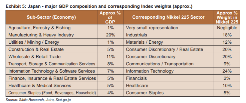 The Japanese Index clear is heavy on consumer discretionary and Real Estate compared to its weight in the GDP.