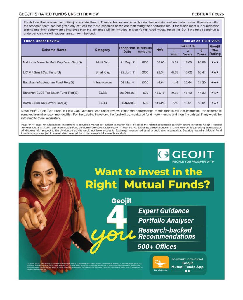 OOUR TOP RATED MUTUAL FUNDS Geojit’s rated funds under review – February 2026 byGeojit TeamJanuary 29, 2026 Business recruitment or hiring photo concept. Looking for talent. Icons of candidates are standing on open newspaper under magnifier. 0 Shares 0 0 0 0 0 Shares: Share 0 Tweet 0 Share 0 Share 0 Geojit Team Leave a Reply Cancel replyYour email address will not be published. Required fields are marked *Comment * Name * Email * Website Save my name, email, and website in this browser for the next time I comment. What is 5 + 3? * View Comments (0)