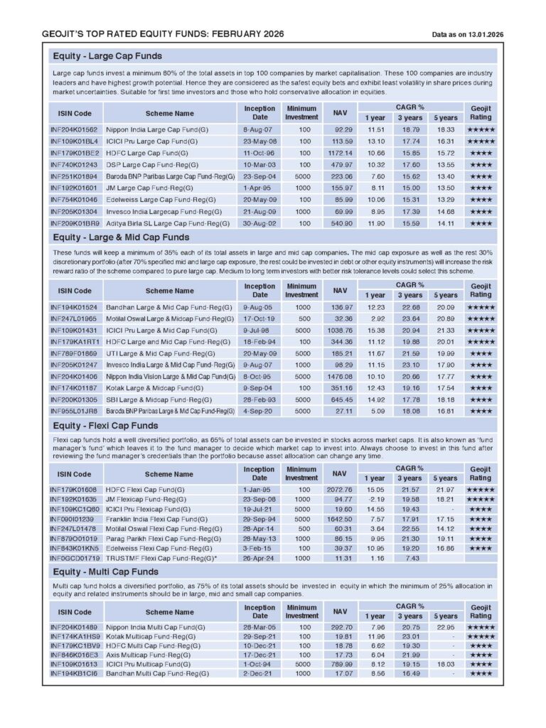 OOUR TOP RATED MUTUAL FUNDS Geojit’s top rated equity funds: February 2026 byGeojit TeamJanuary 29, 2026 0 Shares 0 0 0 0 0 Shares: Share 0 Tweet 0 Share 0 Share 0 Geojit Team Leave a Reply Cancel replyYour email address will not be published. Required fields are marked *Comment * Name * Email * Website Save my name, email, and website in this browser for the next time I comment. What is 6 + 7? * View Comments (0)