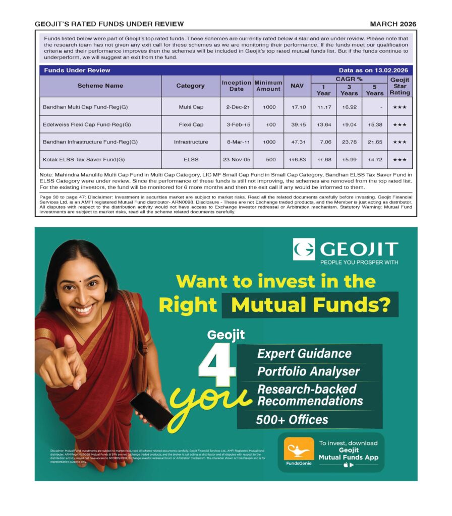 MMutual Funds Geojit’s rated funds under review -March byGeojit TeamFebruary 27, 2026 Business recruitment or hiring photo concept. Looking for talent. Icons of candidates are standing on open newspaper under magnifier. 0 Shares 0 0 0 0 0 Shares: Share 0 Tweet 0 Share 0 Share 0 Geojit Team Leave a Reply Cancel replyYour email address will not be published. Required fields are marked *Comment * Name * Email * Website Save my name, email, and website in this browser for the next time I comment. What is 9 + 8? * View Comments (0)