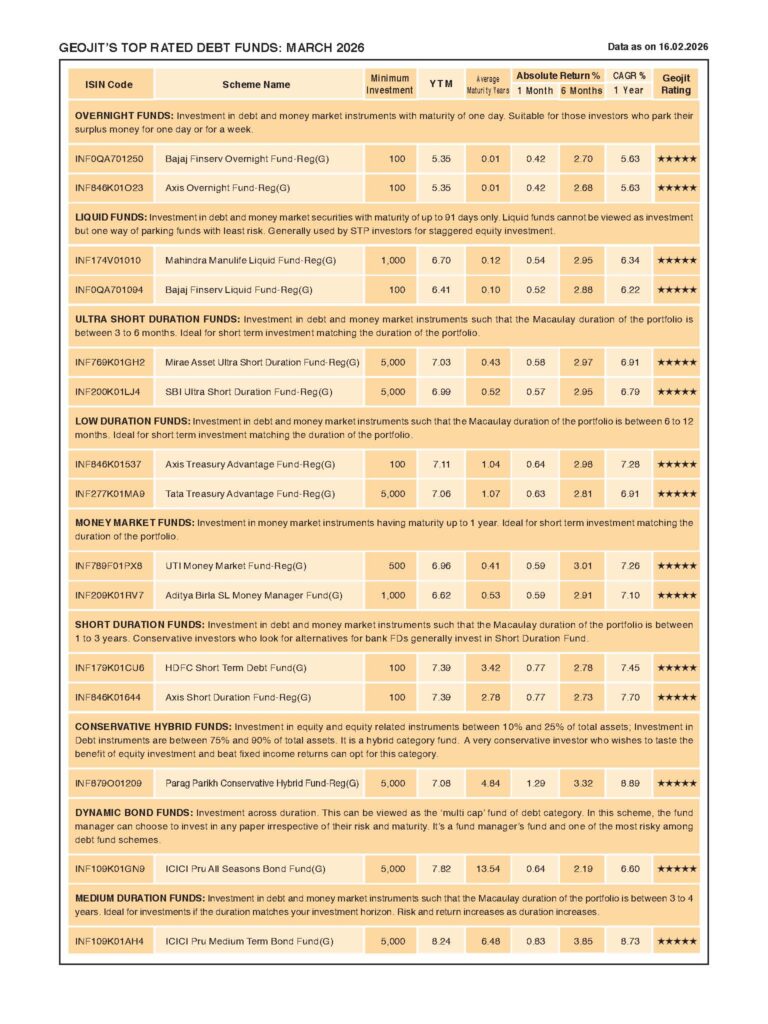22026 Geojit’s top rated debt funds – March 2026 byGeojit TeamFebruary 27, 2026 0 Shares 0 0 0 0 0 Shares: Share 0 Tweet 0 Share 0 Share 0 Geojit Team Leave a Reply Cancel replyYour email address will not be published. Required fields are marked *Comment * Name * Email * Website Save my name, email, and website in this browser for the next time I comment. What is 5 + 1? * View Comments (0)