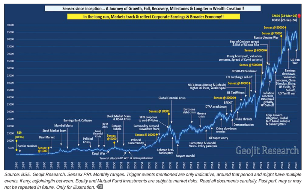 Let’s look at the journey of the Sensex from 100 in 1979 to where it is now. The market faced many crises like assassination of prime ministers, political instability, wars, natural calamities, sanctions and economic crises. Apart from these domestic crises, the market was impacted by global economic crises and market meltdowns.