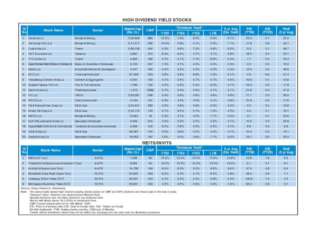 EEquity Markets High Dividend Yield Stocks – April 2026 byGeojit TeamMarch 31, 2026 Dividends Investment Business Graph 0 Shares 0 0 0 0 0 Shares: Share 0 Tweet 0 Share 0 Share 0 Geojit Team Leave a Reply Cancel replyYour email address will not be published. Required fields are marked *Comment * Name * Email * Website Save my name, email, and website in this browser for the next time I comment. What is 6 + 7? * View Comments (0)