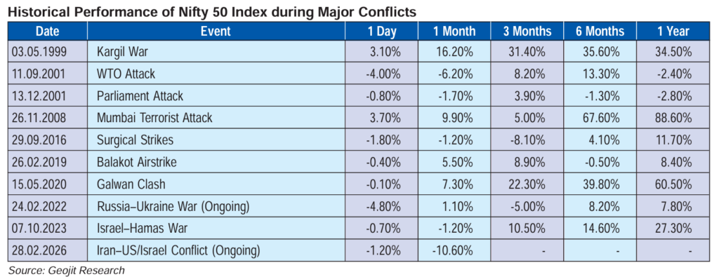 The ripple effects of global uncertainty have been strongly felt in Indian equity markets. The level of impact is based on the tenure of the war, global financial & economic risk, and volatility of crude. The Iran war has impacted India given its high vulnerability to oil prices and energy availability. India was already in the phase of consolidation due to trade issues, selling in tech, and FIIs’ risk-off strategy. Nifty50 has fallen from its 52-week high of 26,373 down by ~15%, indicating the depth of the overall correction.