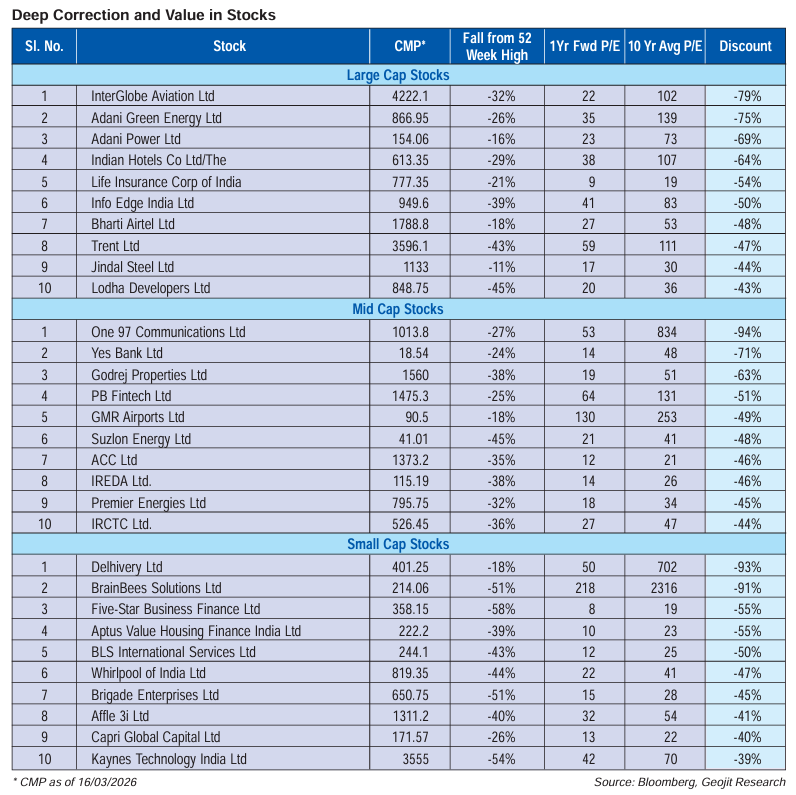As a result, India’s market valuations have undergone a meaningful correction toward the lower end of their 5-year range, after historically trading at a premium supported by strong macro fundamentals and robust domestic investor participation. This correction places the market in a more favourable position for a healthy rebound, contingent on the assumption that the ongoing geopolitical conflict remains short-lived. Notably, several rated stocks have seen sharp declines in both prices and valuations, as reflected in their 52-week performance, creating selective opportunities for investors.